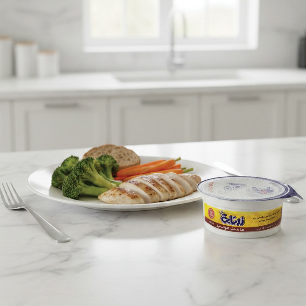 ماست موسیر تکنفره ۱۵۰ گرم زرناب، تهیهشده از شیر تازه گاو و موسیر طبیعی با طعمی ملایم و دلچسب؛ بافتی کرمی، بستهبندی بهداشتی و مناسب برای مصرف در رستورانها، سازمانها و وعدههای سریع غذایی.